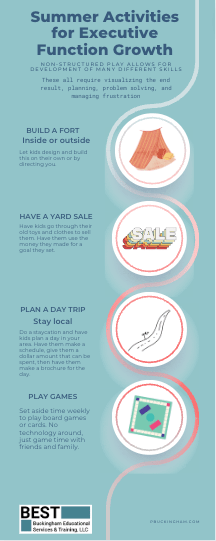 It is June and that means most schools in the US are on summer break or soon will be. Summertime is a great time to work on executive function skills in fun ways. Did you know that unstructured play allows kids to learn in ways that structured play and activities do not? Play supports many executive function skills naturally. This can include goal setting, planning and prioritizing, emotional control, sustained attention, response inhibition, and more.