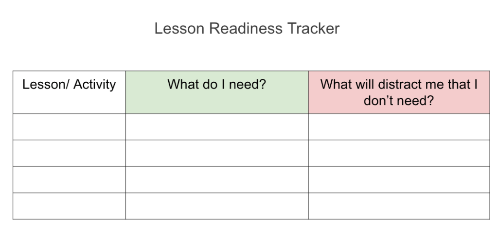 Lesson Readiness Tracker– use to discuss with student what they need and what will distract them during specific activities.
